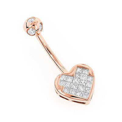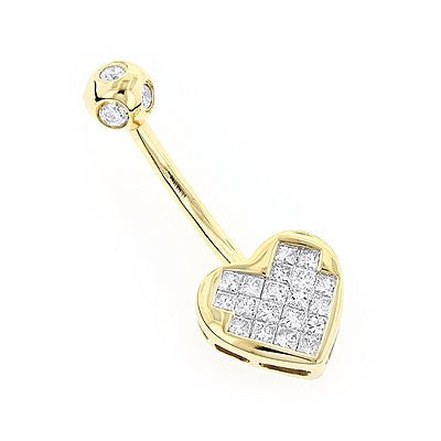 This luscious heart shaped 14K gold diamond belly button ring features 0.66 ctw of sparkling bezel set round diamonds, and 19 princess cut diamonds invisibly set in a highly polished heart shaped gold frame. This diamond belly button ring is available in 14K white, yellow, or rose gold and can be customized with different fancy color diamonds. Item 718004694